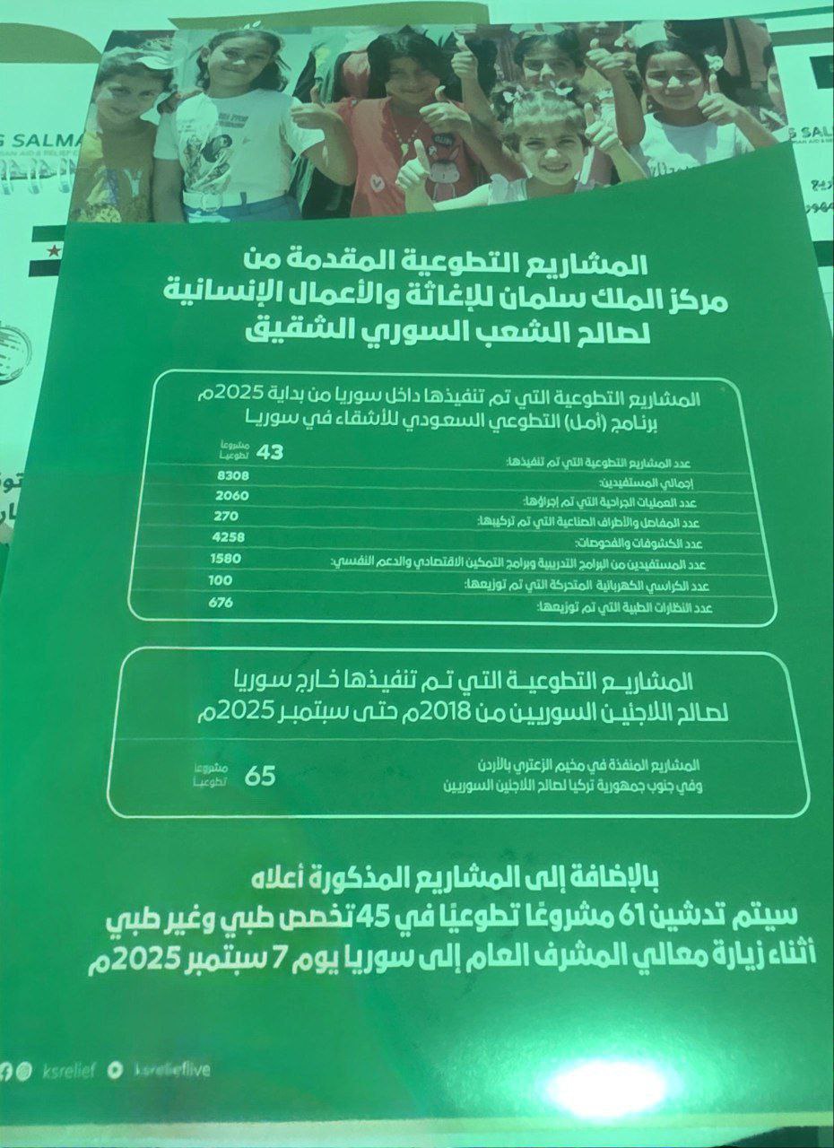 مركز الملك سلمان للإغاثة والأعمال الإنسانية يقدم مشاريع تطوعية لصالح الشعب السوري الشقيق في أيلول 7, 2025 شارك شارك FacebookWhatsAppFacebook MessengerTelegramTwitter