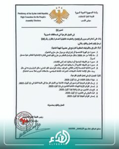 اللجنة العليا لانتخابات مجلس الشعب تُصدر التعميم رقم /3/ لعام 2025 المتضمن الأوراق والثبوتيات المطلوبة للترشح لعضوية الهيئات الناخبة. في أيلول 7, 2025 شارك شارك FacebookWhatsAppFacebook MessengerTelegramTwitter