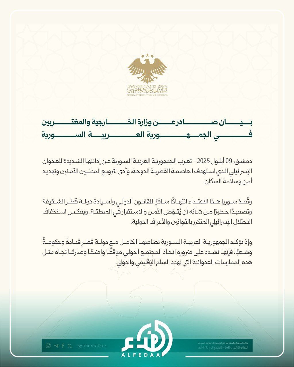 بيان صادر عن وزارة الخارجية والمغتربين في الجمهورية العربية السورية في أيلول 9, 2025 شارك الفداء_ بيان صادر عن وزارة الخارجية والمغتربين في الجمهورية العربية السورية. شارك FacebookWhatsAppFacebook MessengerTelegramTwitter
