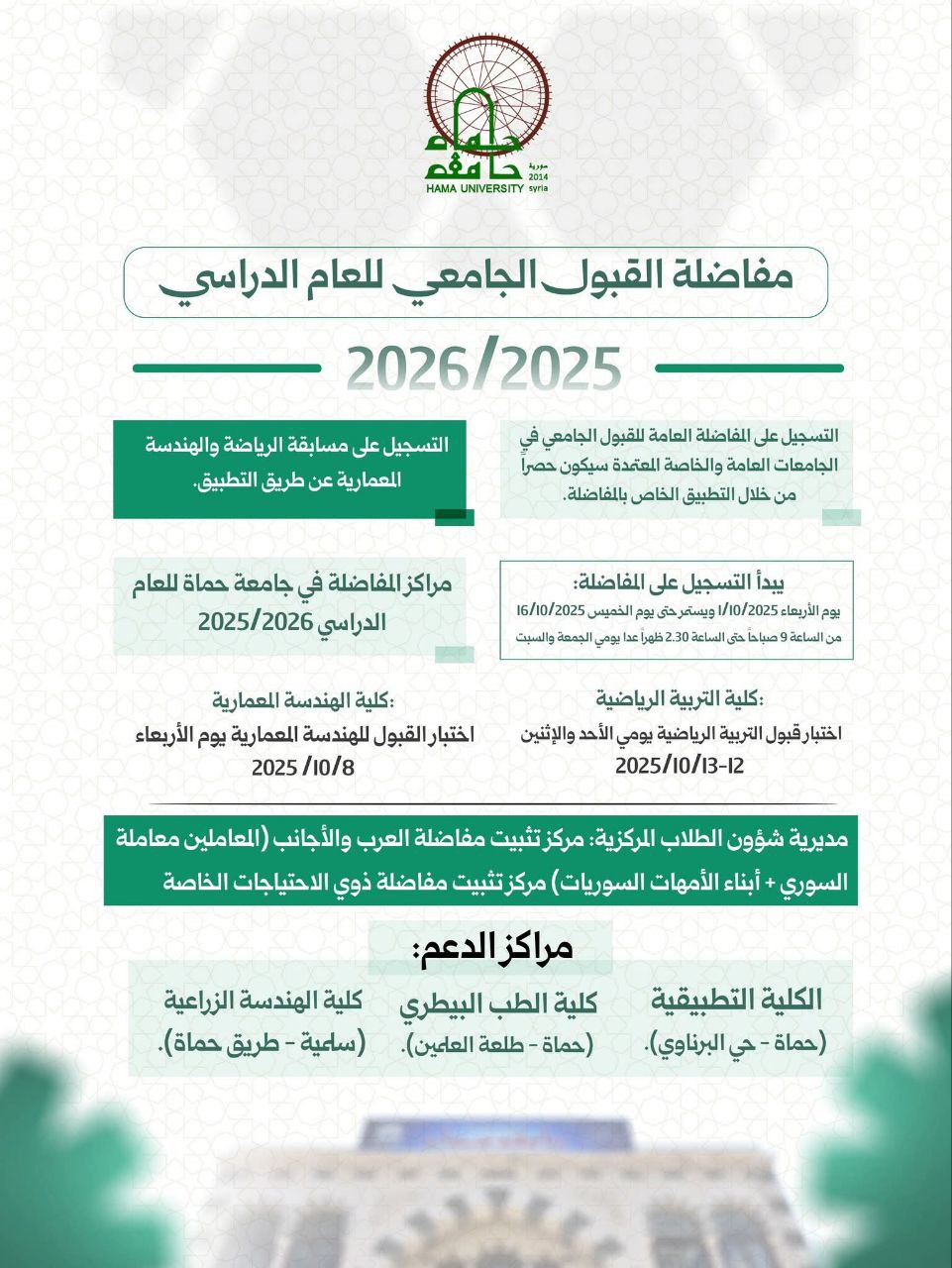 وأوضحت رئاسة جامعة حماة، أن التسجيل يشمل أيضاً مسابقة القبول في كليتي التربية الرياضية، والهندسة المعمارية، حيث يتم التقديم حصراً من خلال التطبيق ذاته، وفق المواعيد المحددة يومياً من الساعة التاسعة صباحاً وحتى الثانية والنصف ظهراً، باستثناء يومي الجمعة والسبت، ليستمر التسجيل حتى 16 من الشهر الجاري.