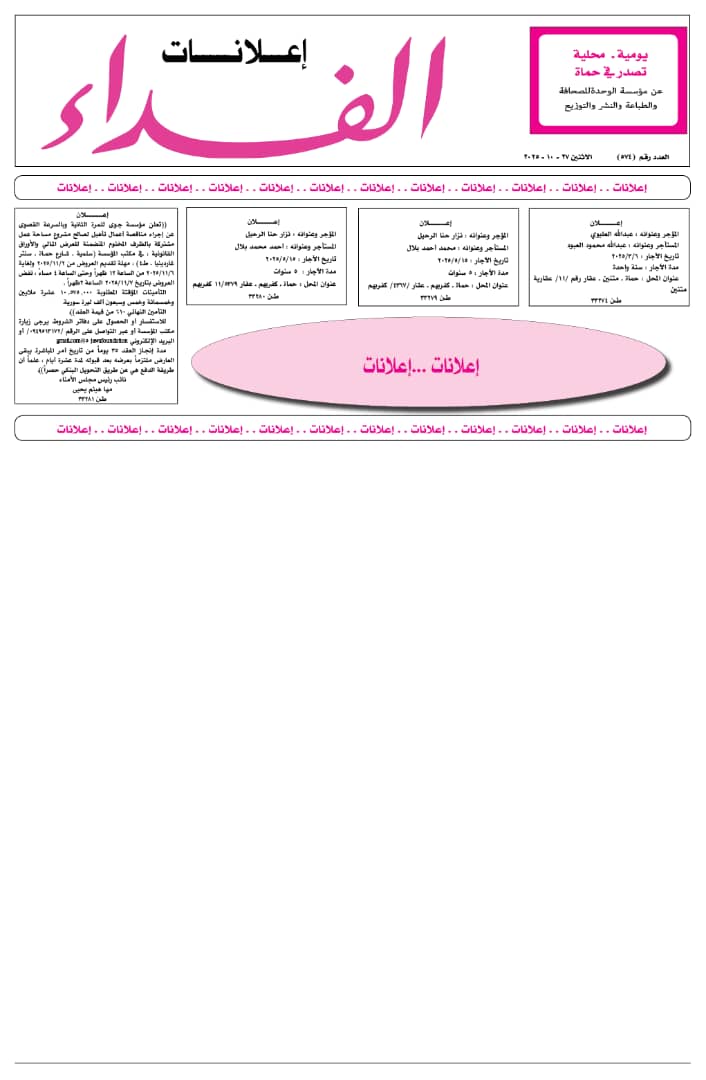 ((تعلن مؤسسة جوى للمرة الثانية وبالسرعة القصوى عن إجراء مناقصة أعمال تأهيل لصالح مشروع مساحة عمل مشتركة بالظرف المختوم المتضمنة للعرض المالي والأوراق القانونية ، في مكتب المؤسسة (سلمية ـ شارع حماة ـ سنتر غاردينيا ـ ط4) ، مهلة تقديم العروض من 2/11/2025 ولغاية 6/11/2025 من الساعة 12 ظهراً وحتى الساعة 4 مساءً ، تفض العروض بتاريخ 7/11/2025 الساعة 2ظهراً .
