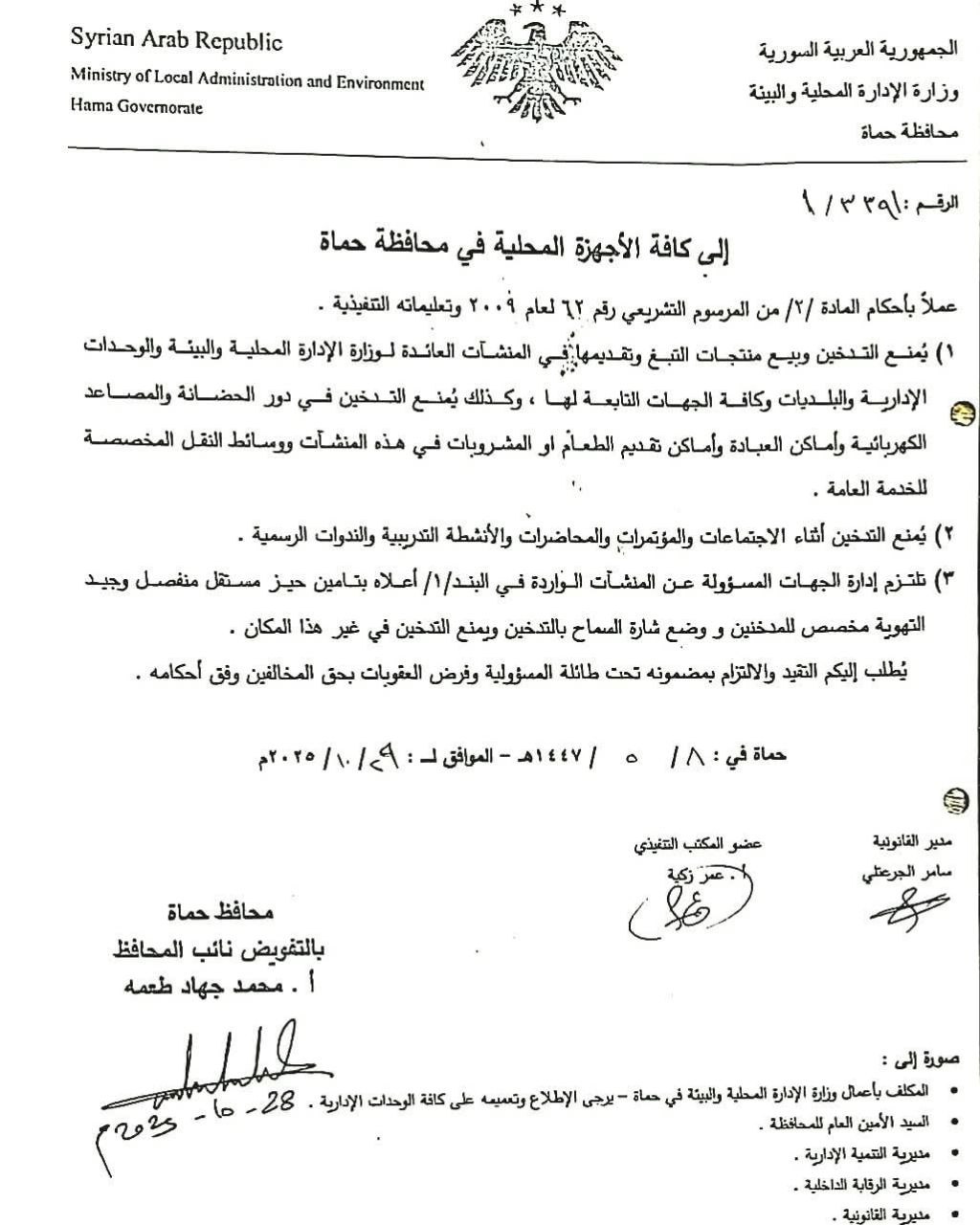 أصدرت محافظة حماة تعميماً بمنع التدخين، وبيع منتجات التبغ في خطوة جدّية تهدف إلى تحسين الصّحة العامة، وحماية الأجيال القادمة بالإضافة إلى تقليل العبء الاقتصادي والبيئي الذي يسببه التبغ، ورفع مستوى الوعي بأضرار التدخين السلبي .