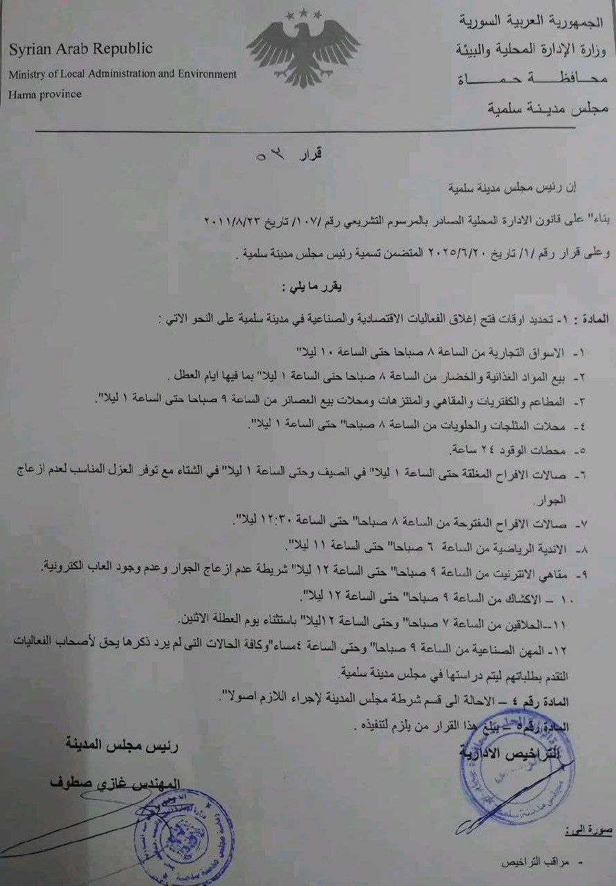 أصدر رئيس مجلس مدينة سلمية المهندس غازي صطوف، قراراً إدارياً ينظم أوقات فتح وإغلاق الفعاليات الاقتصادية والخدمية والصناعية داخل المدينة، بما ينسجم مع متطلبات الحركة التجارية ويحقق التوازن بين النشاط اليومي وراحة السكان.