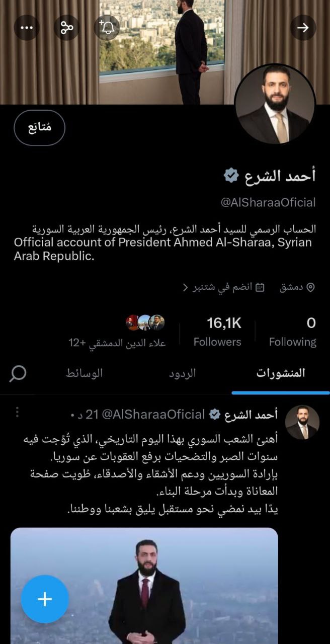 يحمل الحساب الجديد وصفاً واضحاً يؤكد رسميته: “الحساب الرسمي للرئيس أحمد الشرع رئيس الجمهورية العربية السورية”، وقد انضم إلى المنصة في الثامن والعشرين من أيلول الماضي. ومع أن الحساب لم ينشر بعد أي تغريدات، إلا أنه يُتوقع أن يصبح قناة رئيسية لمشاركة التصريحات الرسمية، والتحديثات حول السياسات الحكومية، والتفاعل مع المواطنين.