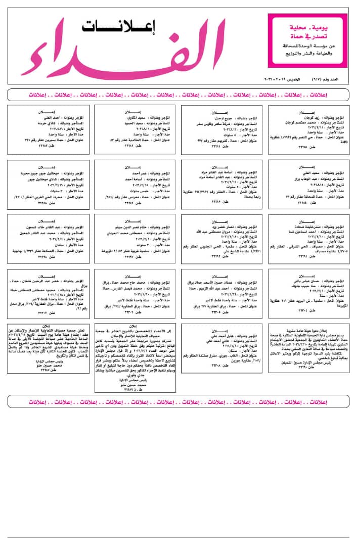 يدعو مجلس إدارة الجمعية التعاونية السكنية في صحة حماة الأعضاء التعاونيين في الجمعية لحضور الاجتماع السنوي للهيئة العامة بتاريخ 10/3/2026 الساعة العاشرة والنصف صباحاً في صالة التعاون السكني بحماة.