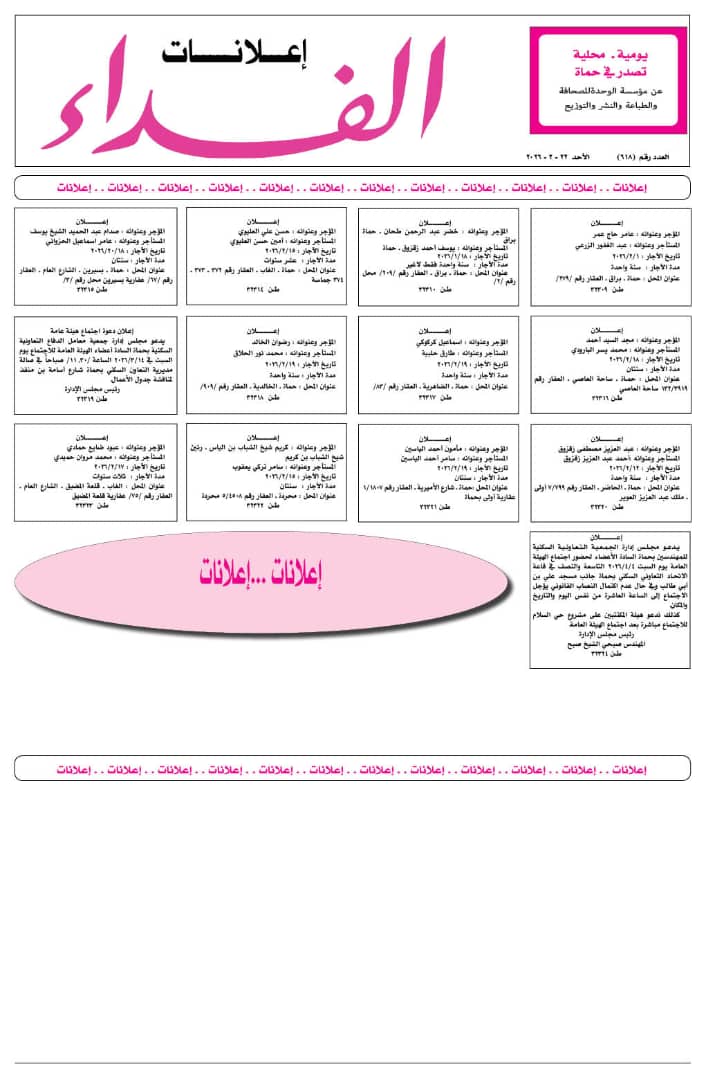 يدعو مجلس إدارة جمعية معامل الدفاع التعاونية السكنية بحماة السادة أعضاء الهيئة العامة للاجتماع يوم السبت في 14/3/2026 الساعة /11.30/ صباحاً في صالة مديرية التعاون السكني بحماة شارع أسامة بن منقذ لمناقشة جدول الأعمال.