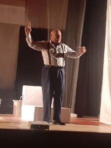 جاءت فرقة مسرح حلب العمالي والتي عمرها ناهز الخمسين عاما ، جاءت من حلب لتشارك جمهور حماة عملها المسرحي هذا، لتضاء أنوار المسرح ويبدأ العرض الذي تألق فيه البطل مجسداً ومشخصاً النص بكل تعبيراته وفكره، حيث كان النص غنياً بالفكر ثرياً بمفردات شاعرية وجذلة ، استطاع الشيخ بث الحياة فيه من خلال خبرته ومهارته، عمل أبكى الحاضرين وأسعد الناقدين ، فكان لنا مع مؤلفه وقفة حول هذا العمل وهو محمد حجازي رئيس دائرة المسرح القومي في حلب ومدير المكتبة العامة فيها: