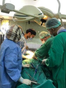 وبين خلوف أنه وبعد تحضير الكولونات، تم إجراء عمل جراحي تحت التخدير العام، بفتح بطن ناصف أسفل السرة مع تمديد الشق قليلاً أعلى السرة لإصلاح فتق سرة مرافق، ثم استئصال حوالي 40سم من الكولون السيني وإعادة الوصل بمفاغرة نهائية نهائية للوصول إلى طول قريب من الطبيعي وباقي الكولونات لم تُبدِ تطاول مهم جراحيّاً.