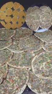 مكوناتها الاساسية اللحمة الحمراء المفرومة على السيخ واللحمة البيضاء (الليه) بالاضافة للفليفلة الخضراء والحمراء والعجين المختمر