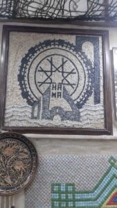 يتم صناعة لوحة الفسيفساء برسم المناظر الطبيعية أو التراثية أو الشخصيات أو الرسوم الهندسية على قطعة قماش بيضاء ثم يتم لصق الأحجار المناسبة بواسطة الغراء و تترك لتجف و بعدها تبدأ عملية الشحذ لسطح اللوحة لتظهر