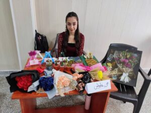 مي علوش إحدى المشاركات في المعرض تقول :إنها تقوم بتدوير بعض أنواع الأقمشة لتصنع منها ورد الساتان اضافة للصباريات واللوحات المجسمة.