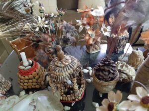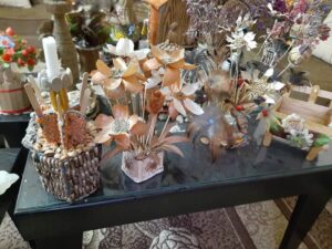 صنعت من قشور البصل ورودا ومن الكرتون مزهرية و جسد دمية ألبستها قماشا صنعته بيديها و من بذور البطيخ مزهرية و أوراق شجر ، حيث صنعت شيئا من اللاشيء رغم عدم تلقيها لأي تعليم أو توجيه ، فهي بدأت بهذا العمل موهبة منها من عمر ال ١٠ سنوات بعمارة بأعواد الكبريت و استمرت إلى يومنا هذا حيث صنعت عددا هائلا من اللوحات الفنية سواء عمل يدوي من مواد مستخدمة أو رسم يدوي كمشهد لمنزل لفت نظرها أو شارع له ذكرى بالنسبة لها.