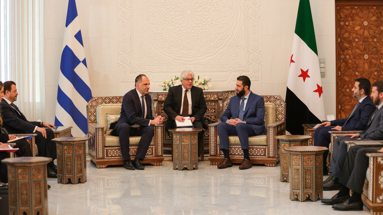 الرئيس الشرع والوزير الشيباني يستقبلان وفدا يونانيا رفيع المستوى في شباط 9, 2025 شارك الفداء_ استقبل رئيس الجمهورية السيد أحمد الشرع ووزير الخارجية السيد أسعد الشيباني في قصر الشعب وفداً يونانيّاً رفيع المستوى برئاسة السيد جيورجيوس جيرابتريتس وزير خارجية اليونان. شارك FacebookWhatsAppFacebook MessengerTelegramTwitter