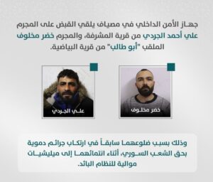 جهاز الأمن الداخلي في مصياف يلقي القبض على المجرم “علي أحمد الجردي” من قرية المشرفة، والمجرم “خضر مخلوف” الملقب أبو طالب من قرية البياضة. في شباط 26, 2025 شارك شارك FacebookWhatsAppFacebook MessengerTelegramTwitter