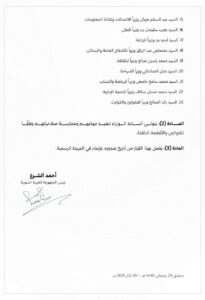 رئاسة الجمهورية: قرار رئاسي بإعلان التشكيل الوزاري لحكومة الجمهورية العربية السورية في نيسان 3, 2025 شارك الفداء_ رئاسة الجمهورية: قرار رئاسي بإعلان التشكيل الوزاري لحكومة الجمهورية العربية السورية. شارك FacebookWhatsAppFacebook MessengerTelegramTwitter