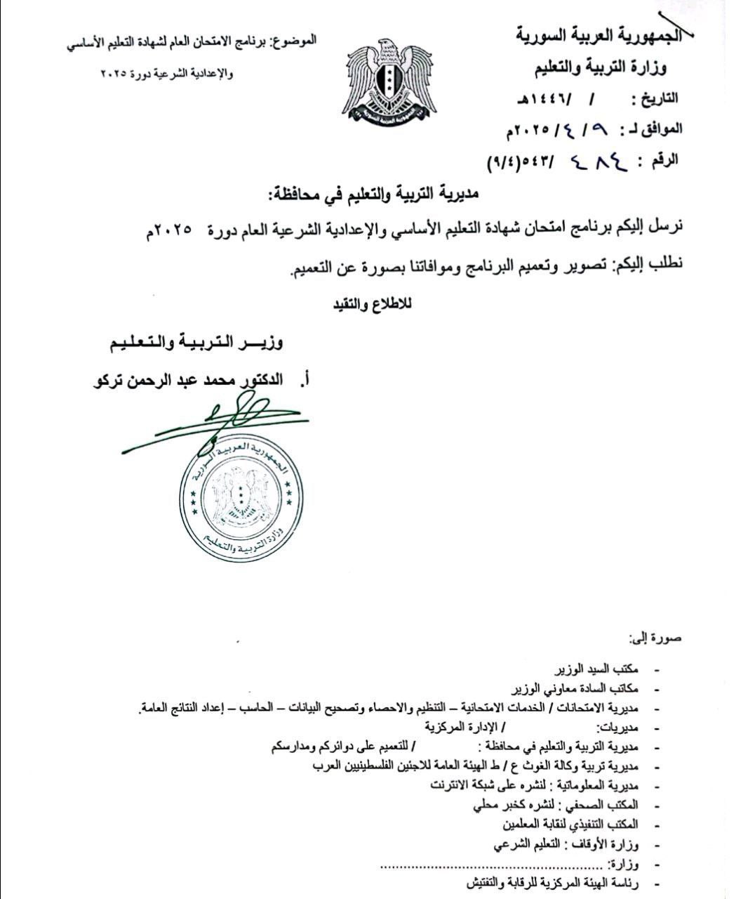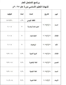 حسب الآتي:برنامج امتحانات شهادة التعليم الأساسي العام والشرعي لدورة عام 2025.