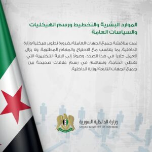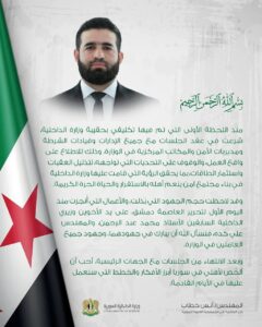 وقد لاحظت حجم الجهود التي بُذلت، والأعمال التي أُنجزت منذ اليوم الأول لتحرير العاصمة دمشق، على يد الأخوين وزيري الداخلية السابقين الأستاذ محمد عبد الرحمن، والمهندس علي كده، فنسأل الله أن يبارك في جهودهما، وجهود جميع العاملين في الوزارة.