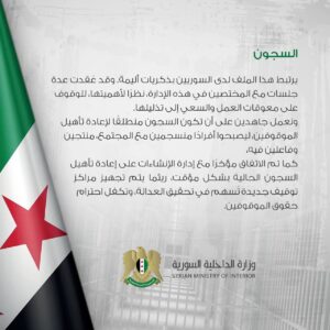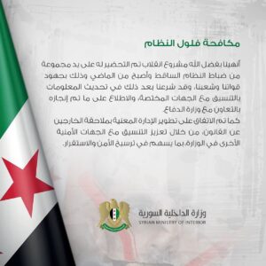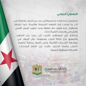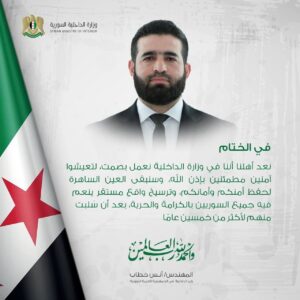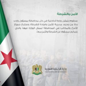 نعد أهلنا أننا في وزارة الداخلية نعمل بصمت، لتعيشوا آمنين مطمئنين بإذن الله، وسنبقى العين الساهرة لحفظ أمنكم وأمانكم، وترسيخ واقع مستقر ينعم فيه جميع السوريين بالكرامة والحرية، بعد أن سُلبت منهم لأكثر من خمسين عامًا.