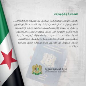 كان من الواضح تركيز الكادر المكلف من قبل وزارة الداخلية على استمرار عمل هذه الإدارة دون توقف منذ اللحظات الأولى لتحرير دمشق، ولا يسعنا إلا أن نشكرهم، حيث تم تجهيز الإدارة فورًا، رغم الأضرار والحرائق التي أصابت مقرها الرئيسي، وقد باشرت الإدارة عملها بعد ذلك، حيث تم استخراج أكثر من ١٦٠,٠٠٠ جواز سفر، وتسيير آلاف المعاملات، وما يزال العمل جارياً لتطوير الإدارة، خصوصًا لما لها من ارتباط بمصالح الناس وشؤون حياتهم.