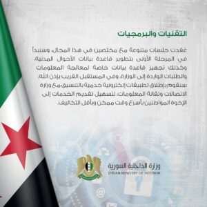 عُقدت جلسات متنوعة مع مختصين في هذا المجال، وسنبدأ في المرحلة الأولى بتطوير قاعدة بيانات الأحوال المدنية، وكذلك تجهيز قاعدة بيانات خاصة لمعالجة المعلومات والطلبات الواردة إلى الوزارة، وفي المستقبل القريب بإذن الله، سنقوم بإطلاق تطبيقات إلكترونية خدمية بالتنسيق مع وزارة الاتصالات وتقانة المعلومات، لتسهيل تقديم الخدمات إلى الإخوة المواطنين بأسرع وقت ممكن وبأقل التكاليف.