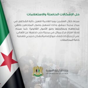 سيتم خلال العشرين يومًا القادمة تفعيل دائرة الشكاوى في مركز مدينة دمشق، وذلك لتسهيل وصول المراجعين وتلقي شكاواهم ومعالجتها وفق الأصول القانونية. كما سيتم لاحقًا افتتاح فرع مماثل في مدينة حلب تخفيفًا عن الأهالي، على أن يتبع ذلك إنشاء فروع إضافية بشكل تدريجي لتغطية كافة المحافظات.