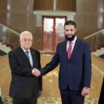رئيس الجمهورية السيد أحمد الشرع ووزير الخارجية السيد أسعد الشيباني يستقبلان الرئيس الفلسطيني السيد محمود عباس والوفد المرافق له في قصر الشعب بدمشق.