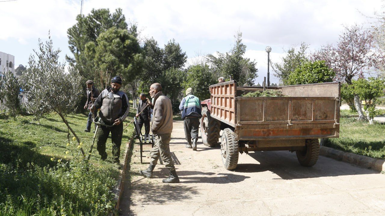 وبين هرموش أنه تم اليوم البدء بأعمال المديرية منذ الثامنة صباحاً، وذلك بتنظيف وفلاحة حديقة على طريق حلب وحديقة دوار الجواش وتنظيف وفلاحة حديقة المخيم، و تقليم أشجار النخيل المثمر على الجزيرة الوسطية لطريق القصر.
