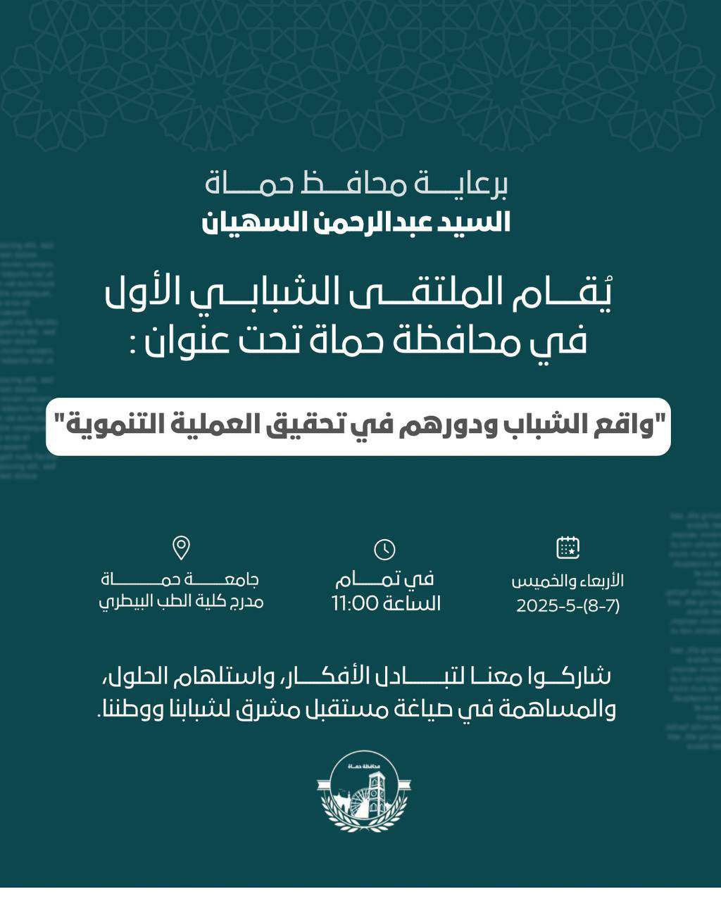 تحت رعاية محافظ حماة السيد عبد الرحمن السهيان، يُقام الملتقى الشبابي الأول في محافظة حماة، تحت عنوان: “واقع الشباب ودورهم في تحقيق العملية التنموية”