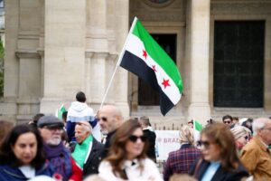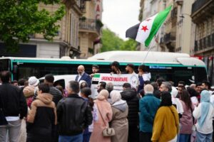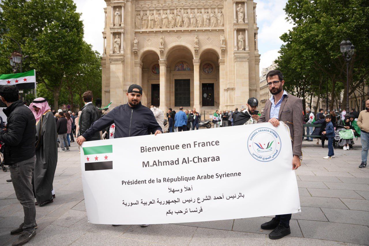 وقفة للجالية السورية في فرنسا وسط باريس للترحيب بزيارة رئيس الجمهورية السيد أحمد الشرع، وللمطالبة برفع العقوبات المفروضة على سوريا