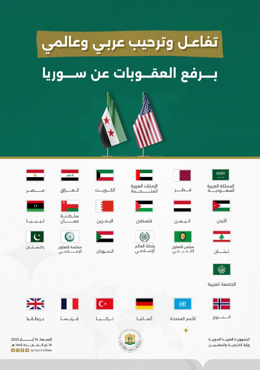 تفاعل وترحيب عربي وعالمي برفع العقوبات عن سوريا في أيار 16, 2025 شارك الفداء_ تفاعل وترحيب عربي وعالمي برفع العقوبات عن سوريا. شارك FacebookWhatsAppFacebook MessengerTelegramTwitter