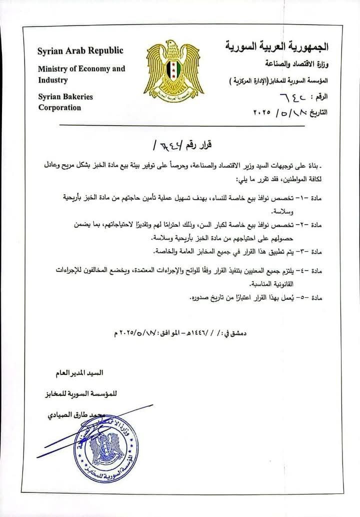 في خطوة تعكس الاحترام والتقدير للفئات الأكثر حاجة للدعم والاهتمام، وجّه وزير الاقتصاد والصناعة بتخصيص نوافذ بيع خاصة بالنساء وكبار السن في جميع المخابز العامة والخاصة على امتداد الأراضي السورية، بهدف تسهيل حصولهم على الخبز دون عناء أو انتظار طويل، بما يضمن كرامتهم ويخفف من معاناتهم.